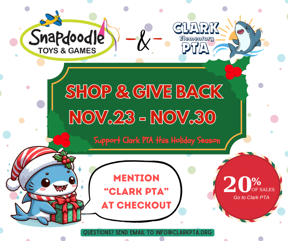 From Nov 23–30, shop at any Snapdoodle Toys & Games location and mention Clark Elementary